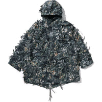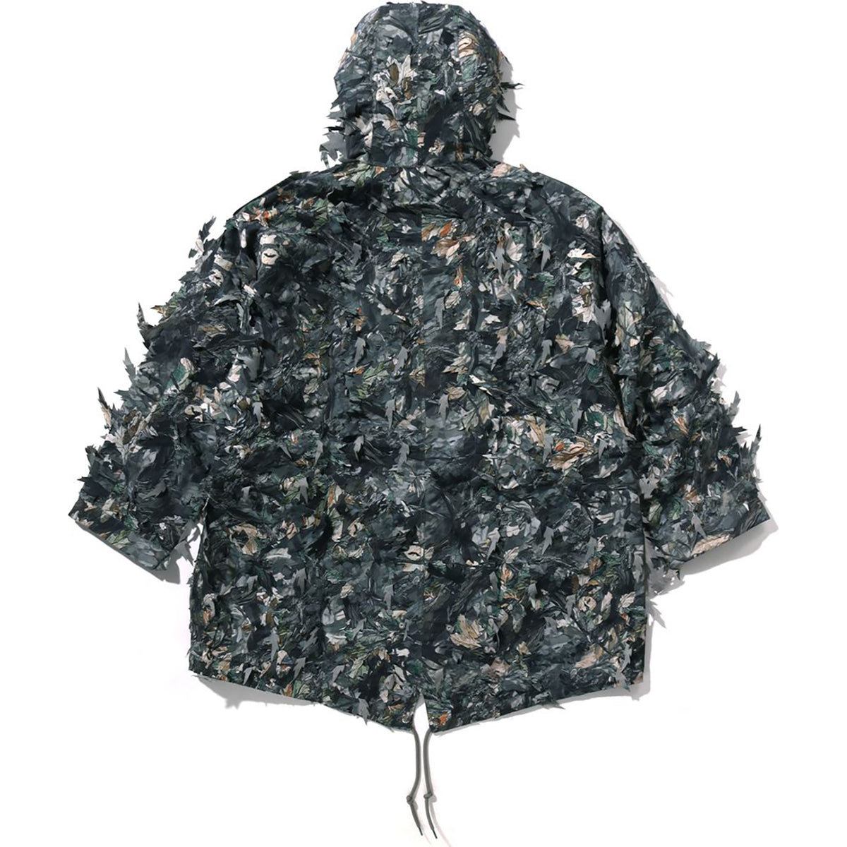 BAPE MENS TREE EDGE CAMO LASER CUT M-51 JACKET features a TREE EDGE CAMO pattern.The design features intricate shapes and intricate details created by laser cutting. The "TREE EDGE CAMO" pattern draws inspiration from traditional hunting camouflage, featuring detailed prints of trees and leaves. Hidden within the design is BAPE's distinctive APE FACE, adding a unique touch of the brand’s playful and clever style.
