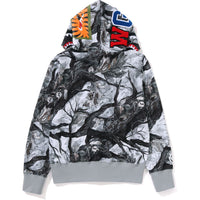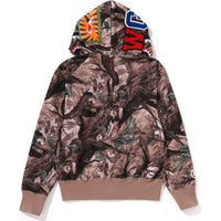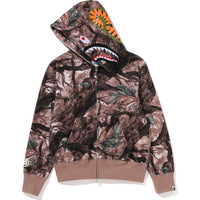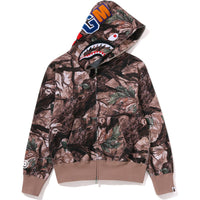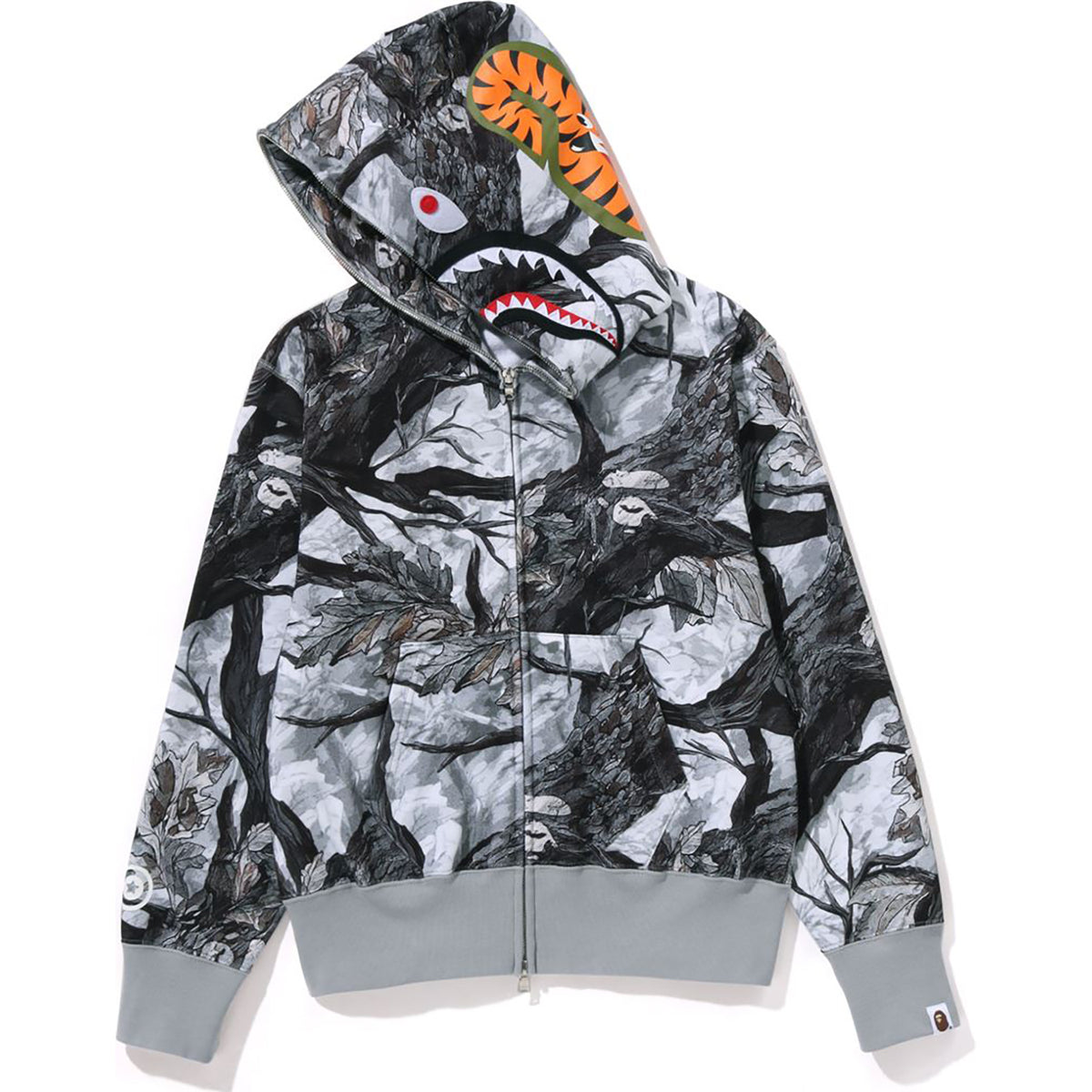 BAPE WOMENS COTTON TREE EDGE CAMO SHARK FULL ZIP HOODIE JACKET offers a cozy fleece lining and showcases the TREE EDGE CAMO design. It includes a unique SHARK patch detail on the hood and has a comfortable regular fit shape.
