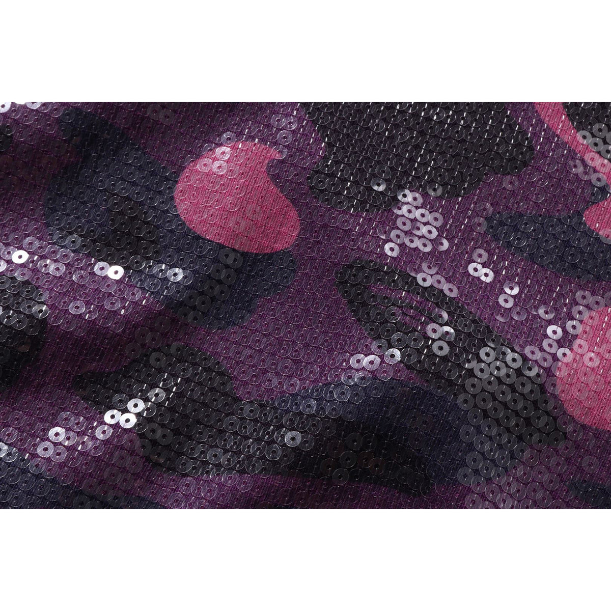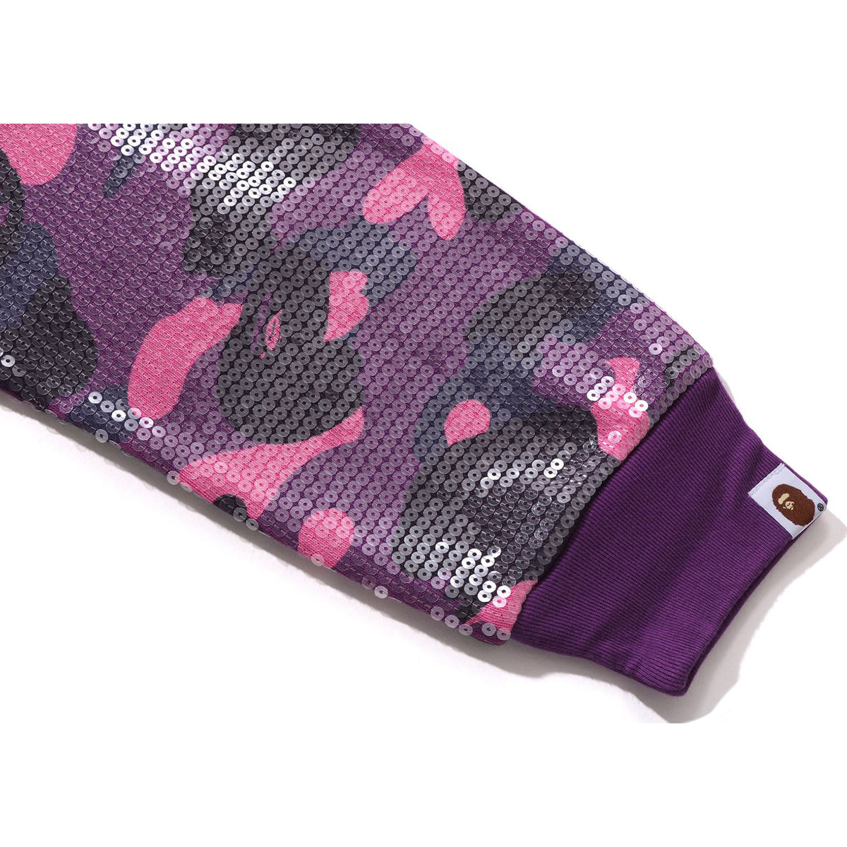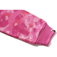 BAPE WOMENS COTTON COLOR CAMO APE HEAD SEQUIN CROPPED FULL ZIP HOOOIE JACKET featuring a COLOR CAMO design enhanced with sequins, this piece showcases the APE HEAD logo printed on the left chest. Its cropped cut offers a laid-back and modern silhouette.