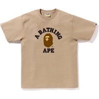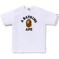 BAPE MENS COTTON COLLEGE T-SHIRT is crafted from premium USA cotton, this COLLEGE TEE MENS showcases a unique round body design. The front chest proudly displays the COLLEGE logo in rubber print, complemented by the classic sleeve tag on the left sleeve. In regular fit, it now comes in fresh color choices and sizes ranging from S to 3XL. Elevate your wardrobe with this stylish and comfortable tee.