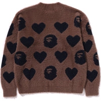 This cozy crew neck sweater features a soft wool blend with a textured knit and a stylish monogram pattern of APE HEAD and heart motifs. It offers a comfortable regular fit and a distinctive APE HEAD pin on the sleeve.
